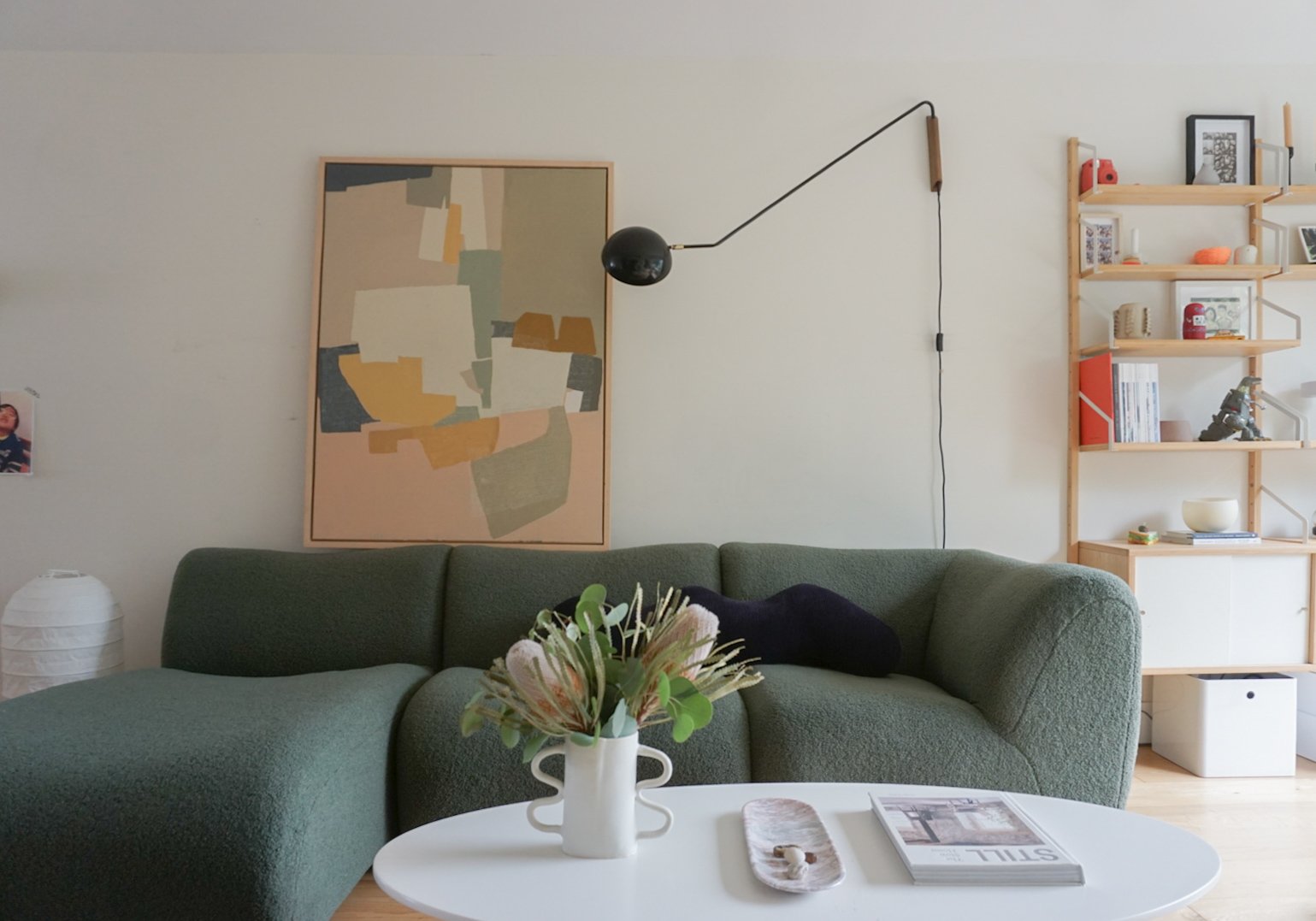 We moved their beloved Rubeena Ratcliffe painting from the dining room to over the sofa. The green of the sofa really complimented the painting and added more colour to the space, something they wanted.