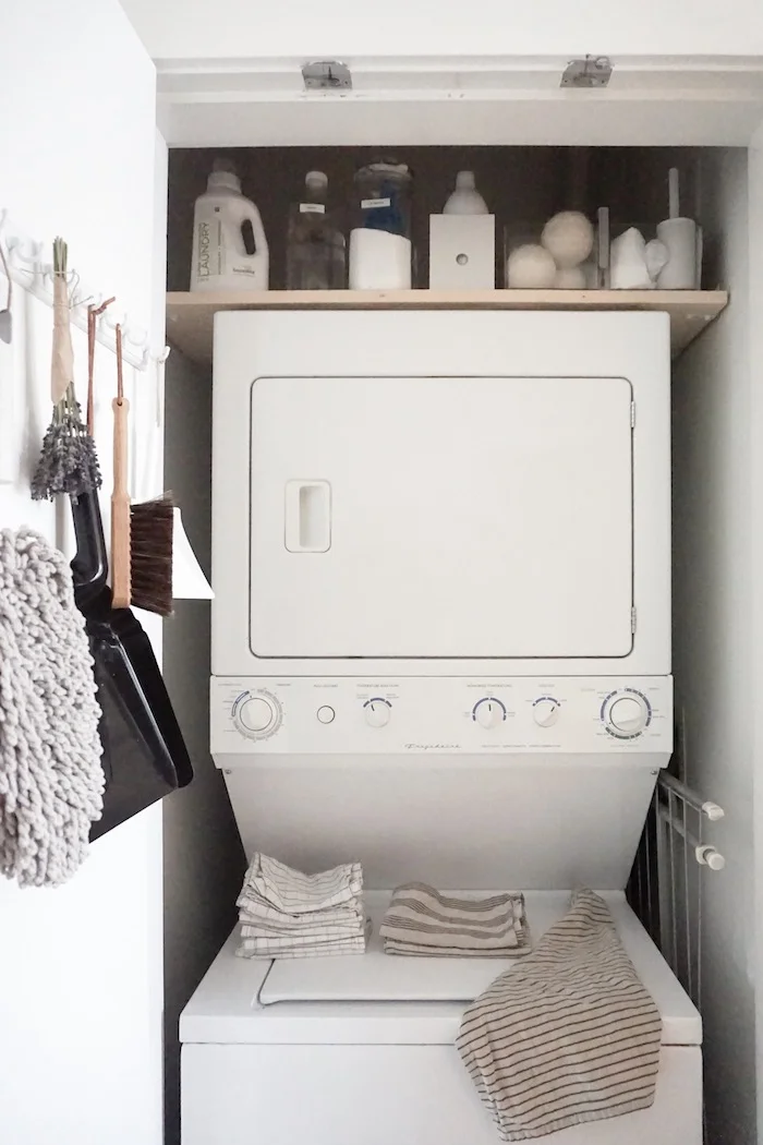 Here is a our stacker that serves us well with our laundry detergents etc above. This is to the left of our built-ins and right beside our front door. Drying rack mentioned is to the right.