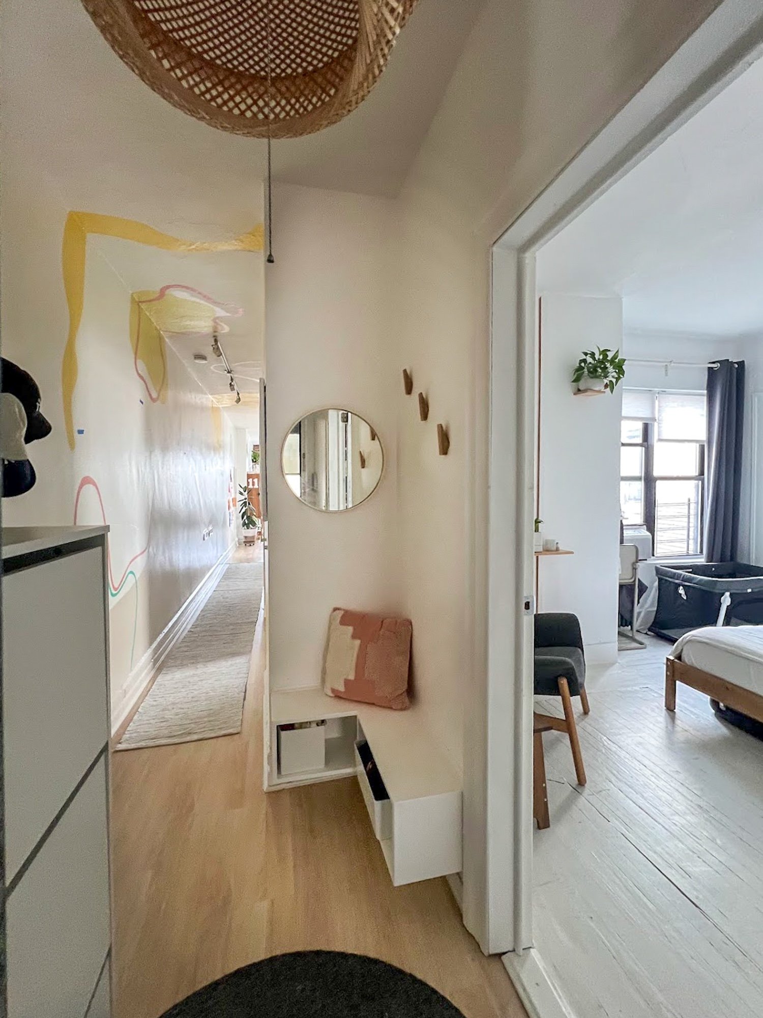 Our apartment has been a great creative outlet for us, too. We've collected a lot from Facebook Marketplace to bring our home style together, and we've DIY'ed a ton (phone booth fish tank, kids' balance board, triple bunks, exposed brick wall, kids' closet and our closet, custom-fit toy shelf under an IKEA cabinet in the living room, kitchen drawers, wood slat wall, floating nightstands, IKEA hacked headboard, 17' long hallway rug, hallway mural and canvases, custom closet doors, entryway bench, etc).